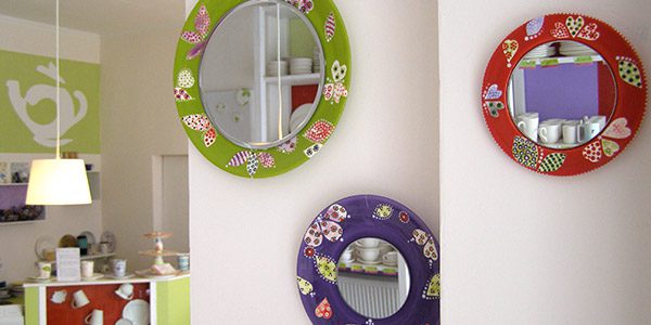 Ob modern oder Vintage – Teller-Spiegel sind wieder in. Bei uns können Sie diese jetzt ganz einfach machen. Einfach einen Teller oder eine Schale wie gewohnt anmalen. Nach dem Brennvorgang bringen wir den Spiegel für Sie an.